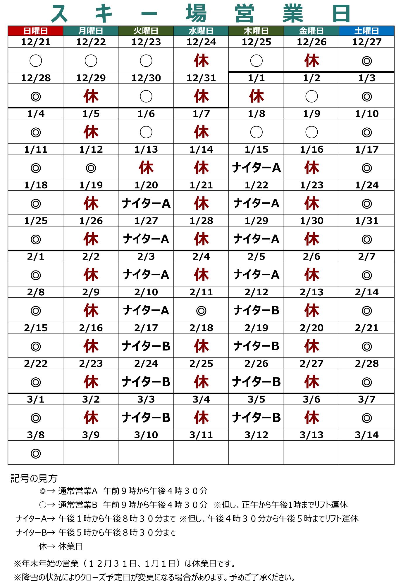 冬期リフト営業期間は、令和7年12月21日(日曜日)から令和8年3月8日(日曜日)までとなります。降雪の状況によりオープン、クローズの予定日は前後いたしますので、予めご了承ください。